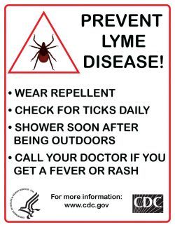Cover all exposed skin areas and/or use repellent when in tick infected areas