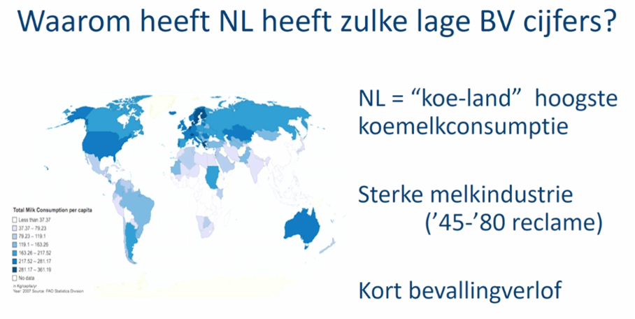NL heeft hele grote melkindustrie en flesvoeding geven is heel normaal. Ook kort bevallingsverlof waardoor bv praktisch ingewikkeld wordt