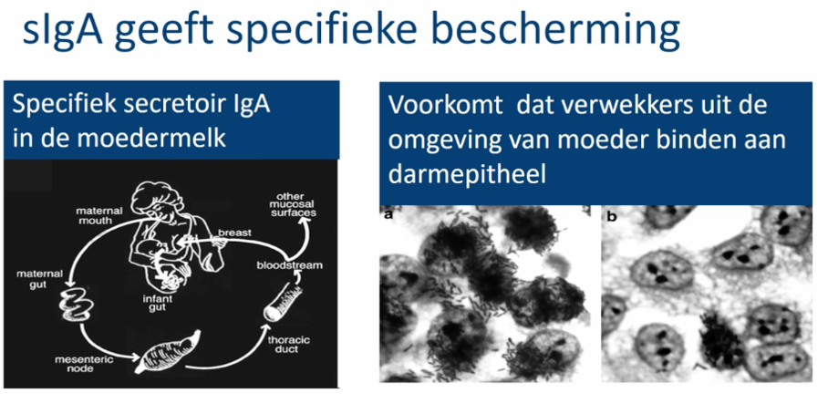 Bij blootstelling aan een pathogeen wordt specifiek secretoir IgA aangemaakt. Dit wordt actief uitgescheiden in de moedermelk en geeft specifieke bescherming tegen factoren in de omgeving van het kind. Dit voorkomt dat verwekkers uit de omgeving van de moeder binden aan het darmepitheel. De hoeveelheid hiervan is maximaal in de periode waarin het kind zelf nog geen igg kan maken. Hierdoor helpt moedermelk het gat in de hoeveelheid immunoglobulinen in de eerste levensmaanden van het kind te verkleinen.