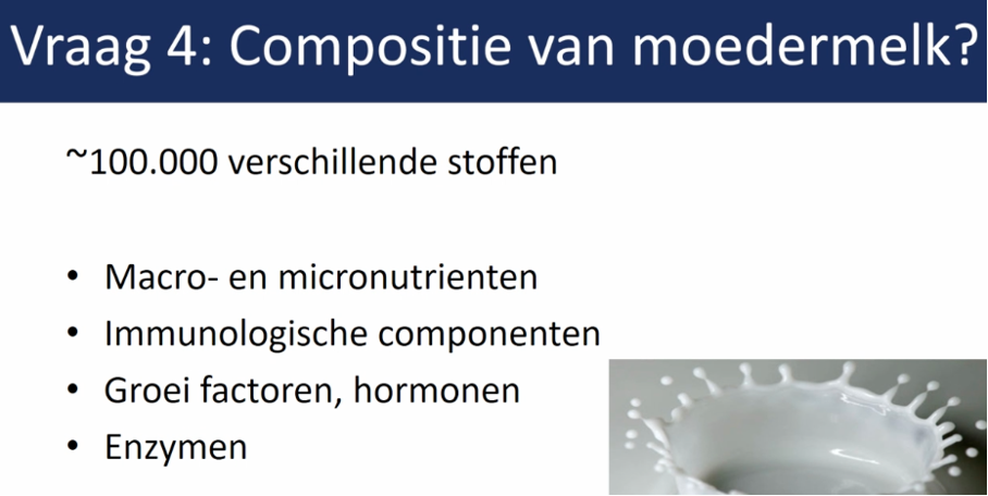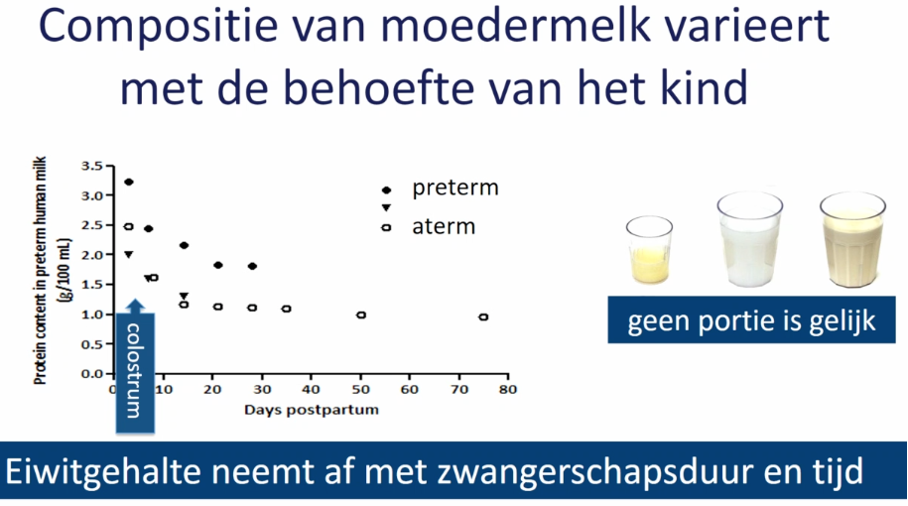 Moedermelk verandert mee met wat het kind nodig heeft. Eiwit gehalte eerst hoog en wordt steeds minder. Prematuren hebben helemaal een hoog eiwitgehalte.