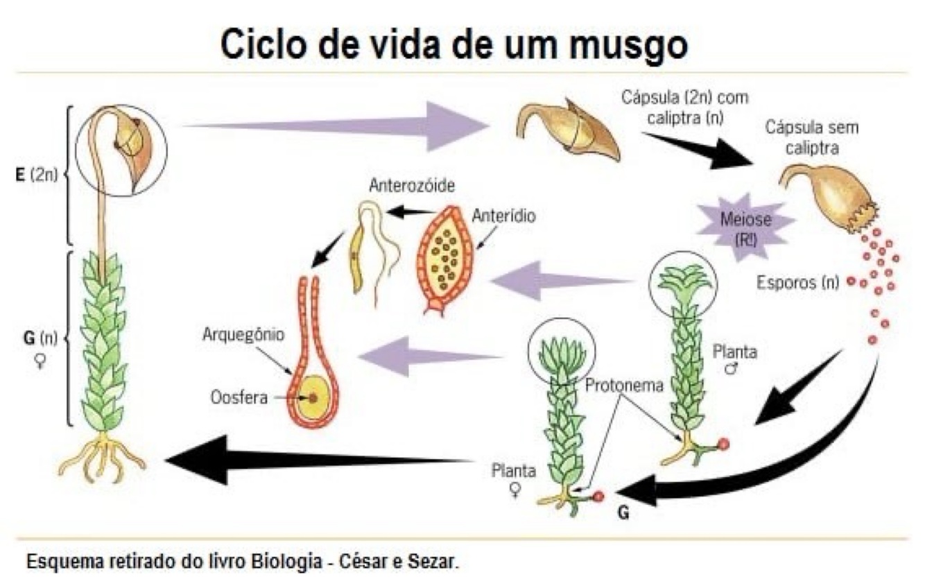 Como é o ciclo reprodutivo de um musgo( briófitas)?