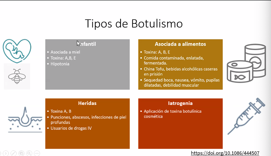 12-72 horas de consumir toxinaContaminación de heridasAlimentos (enlatados, miel)