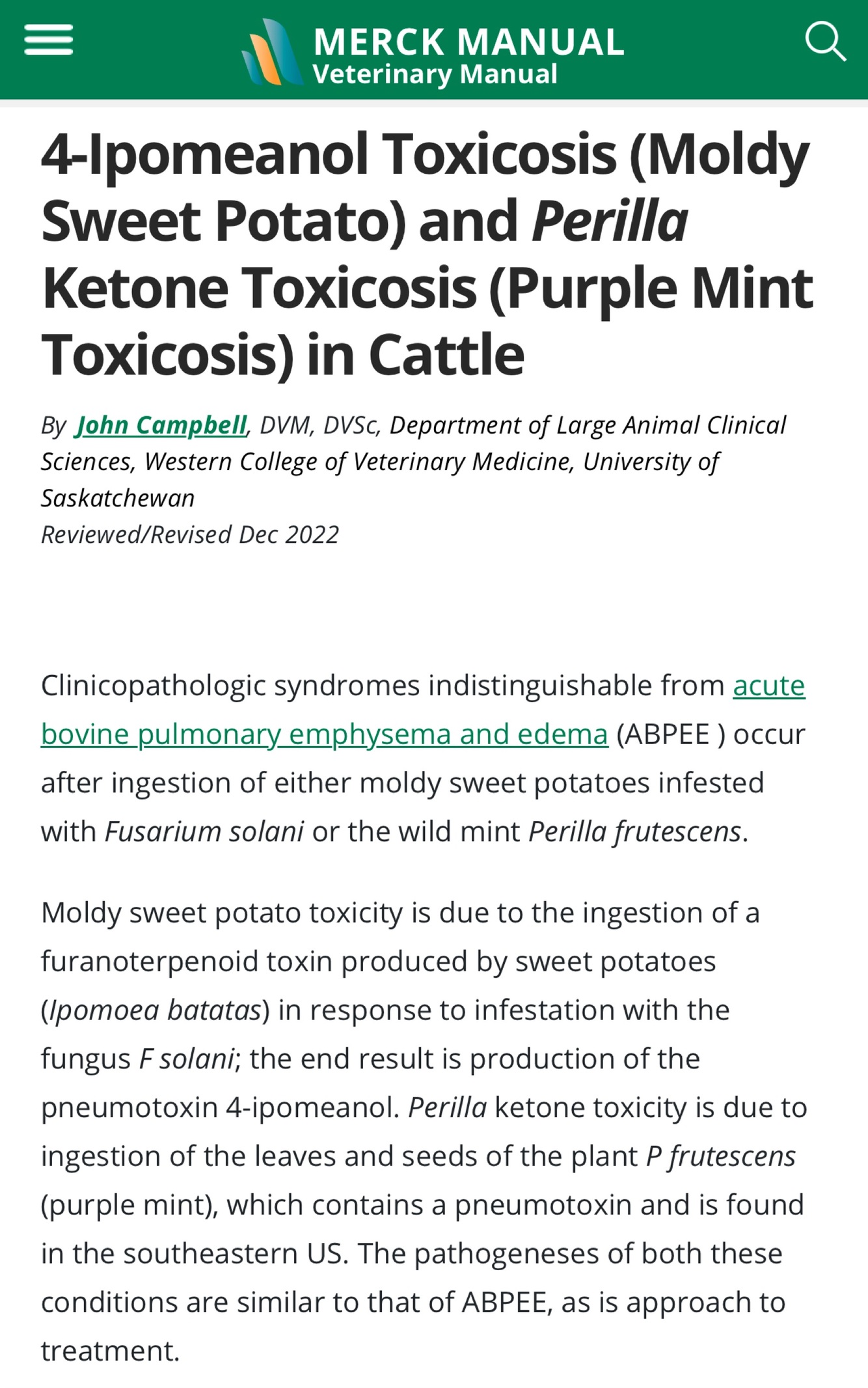 CGPT: 4-Ipomeanol Toxicosis (Moldy Sweet Potato) and Perilla Ketone Toxicosis (Purple Mint Toxicosis) in Cattle