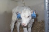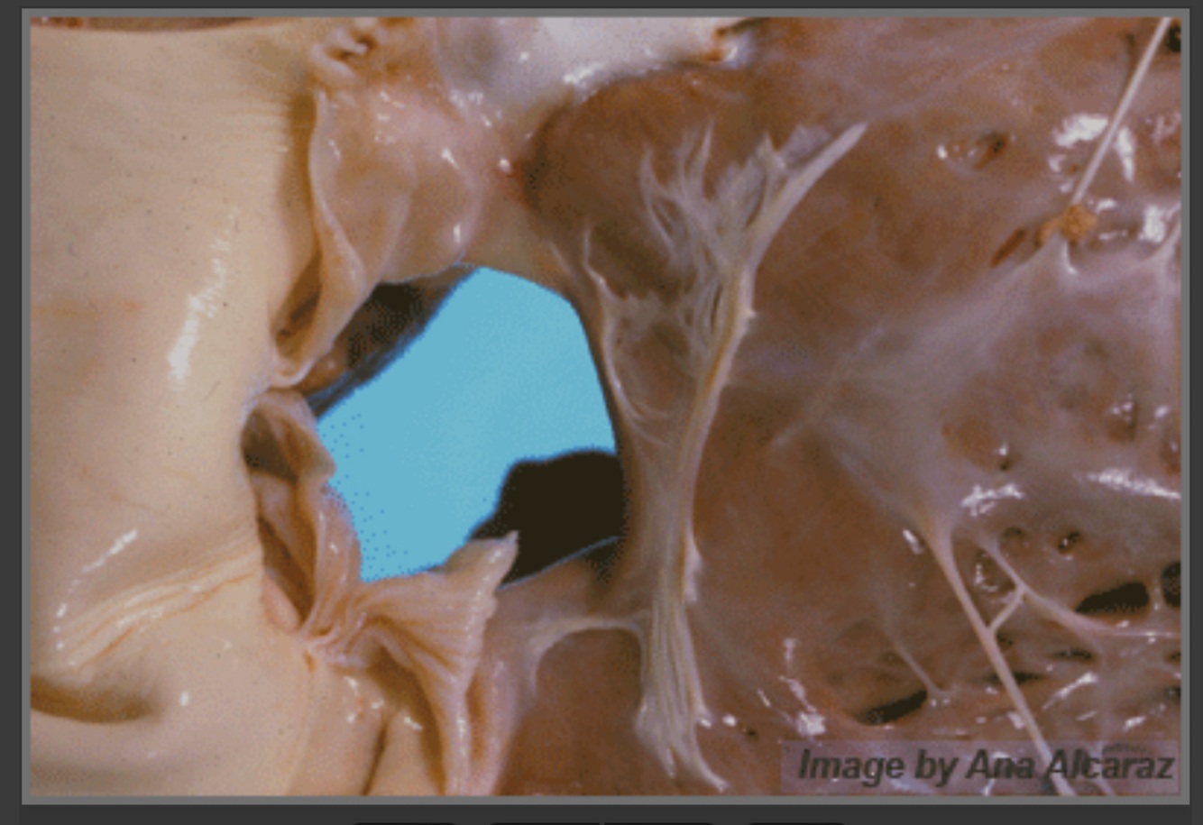 The correct answer is ventricular septal defect. In order to answer this question, you need to “play the odds” and know that VSDs are the most common congenital heart defect in cattle, and they usually present at about 2-3 months of age because they are failing to thrive and/or are developing pulmonary edema and secondary pneumonia. This defect results in oxygenated blood being pushed back into the right atrium and ventricle. In addition, you will see right ventricular dilation and hypertrophy. The increased flow through the right side creates a relative pulmonic stenosis, and thus the murmur is also heard on the left side in the area of the pulmonic valve. VSD is the most common congenital defect in cattle.