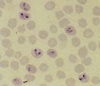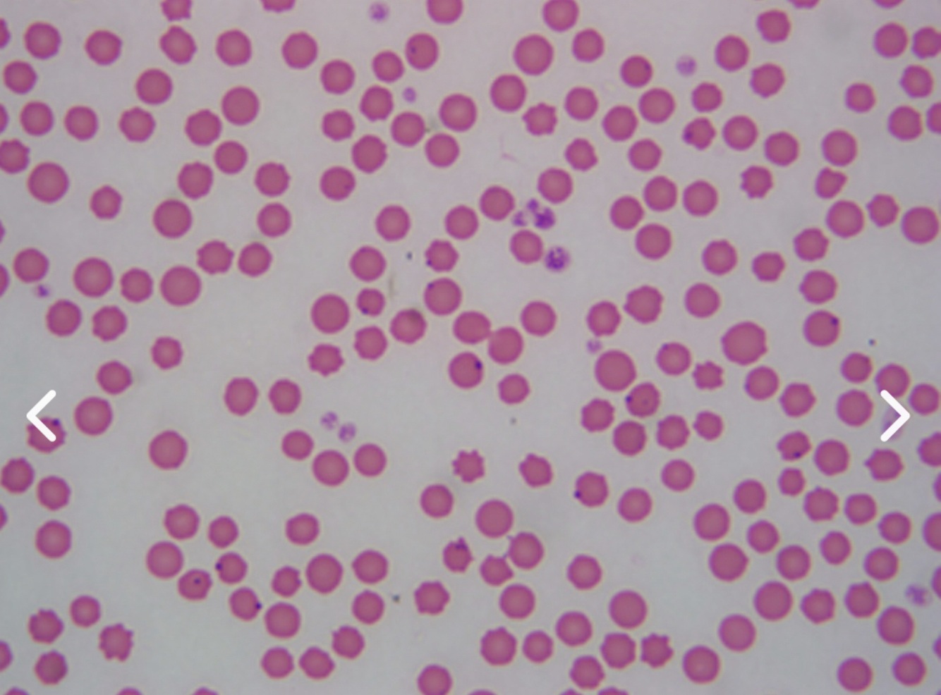 The blood smear shows multiple round Anaplasma marginale along the outer membrane of red blood cells.