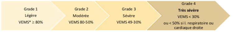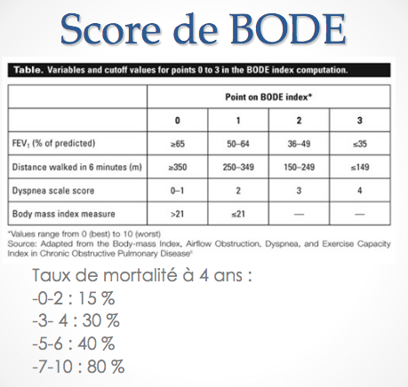 Pronostic : Score pronostique : BODE (côté de 1 à 10 donne un % de mortalité à 4 ans)