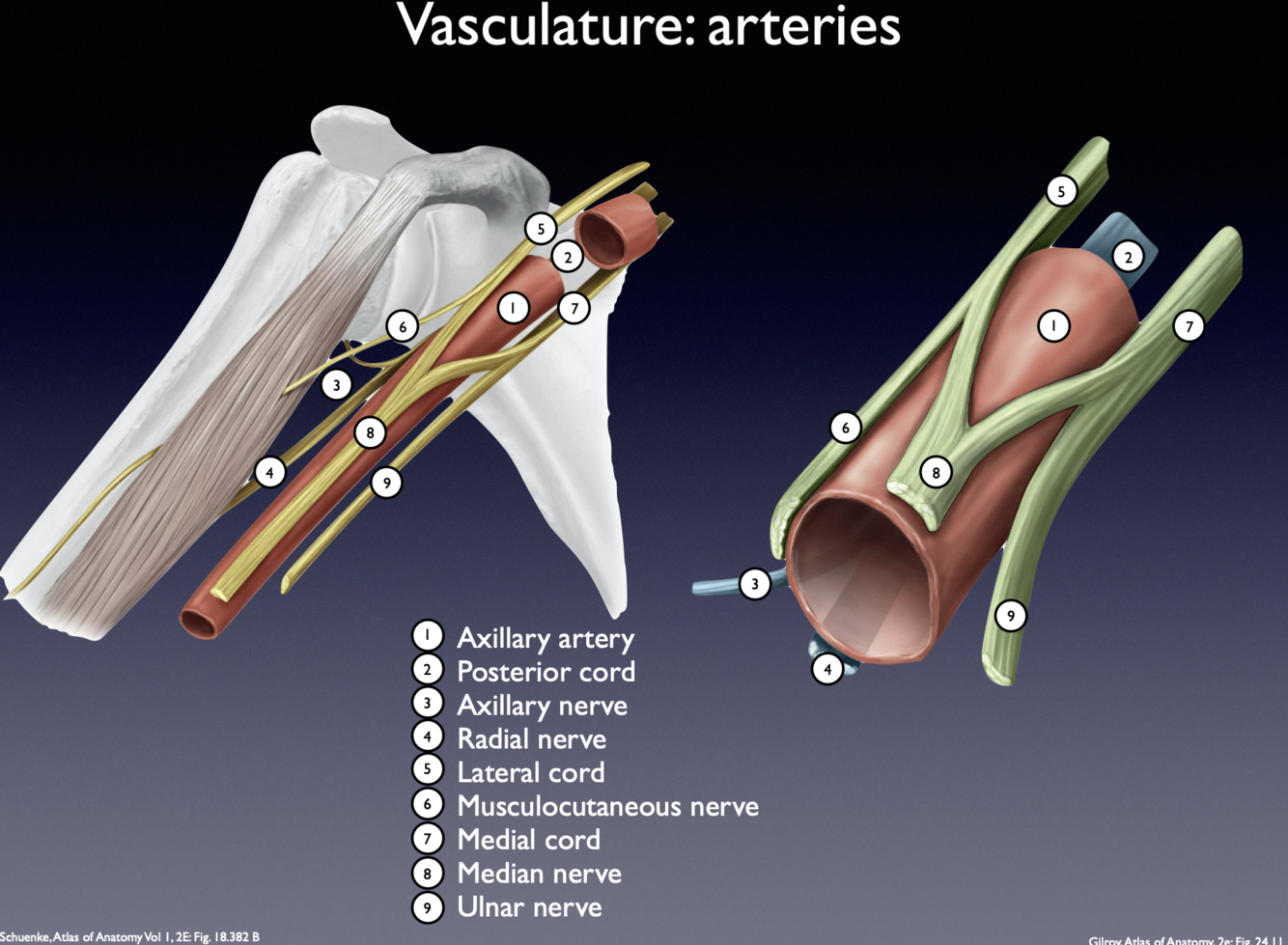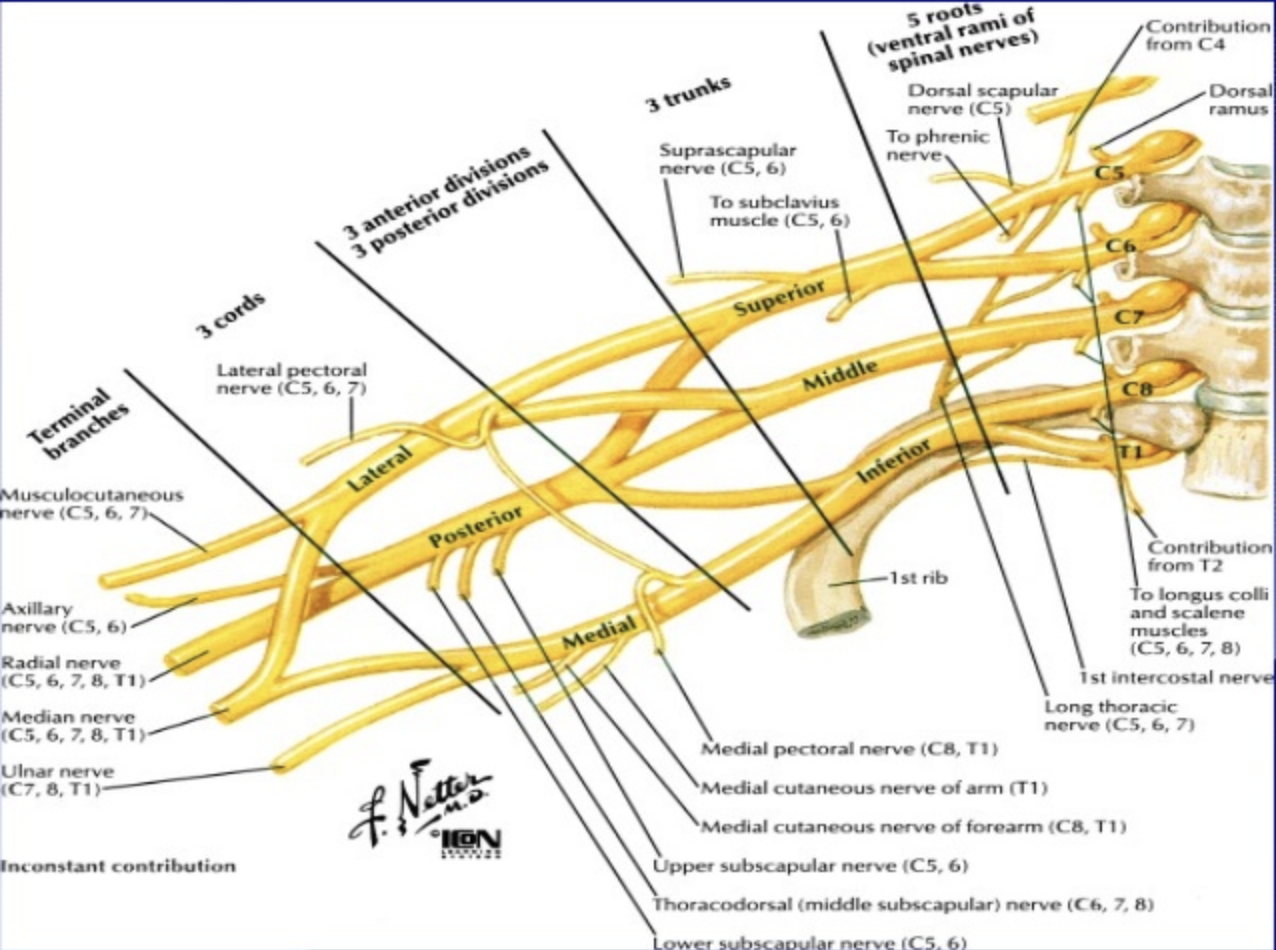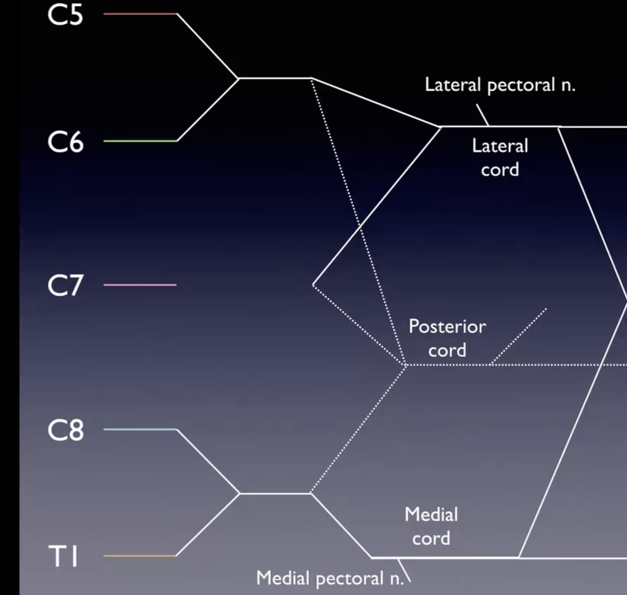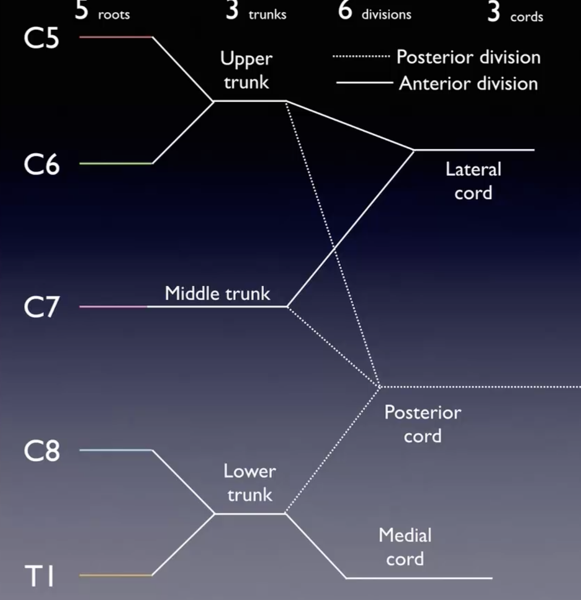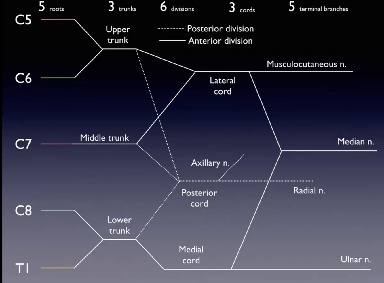 5 ventral rami come together to form 3 trunks (superior, middle, inferior), which then split into 3 anterior and 3 posterior divisions (relative to axillary artery). Divisions come together in axilla to form 3 cords (Lateral, posterior and medial; also named for relationship to axillary artery). The 3 cords then end in 5 terminal branches (axillary nerve, radial nerve, median nerve, ulnar nerve, musculocutaneous nerve).