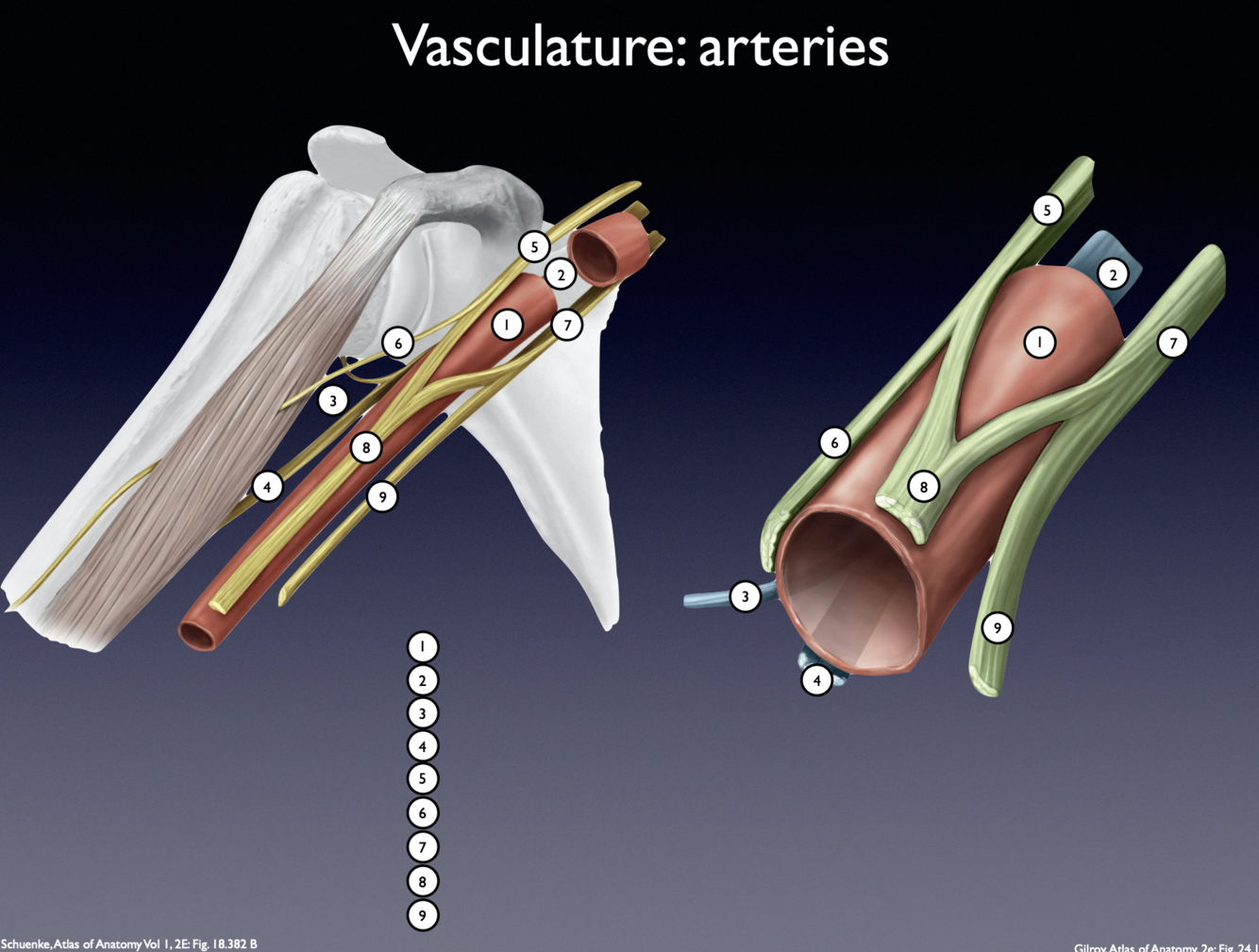 The subscapular nerve (innervates subscapularis and teres major) and the thoracodorsal nerve (innervates latissimus dorsi)