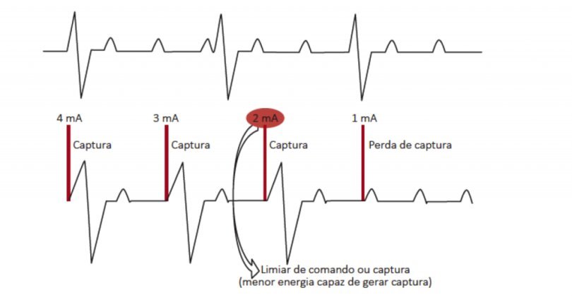 * aumentar lentamente a corrente de estimulação até que os picos do marca-passo sejam visíveis antes de cada complexo QRS (captura elétrica)