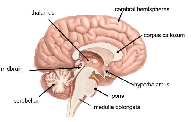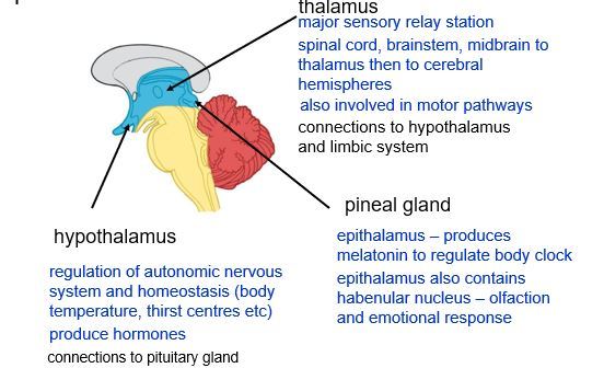 The diencephalon lies deep in the brain and is composed of 3 areas – the largest is the thalamus that is involved with a large number of functional pathways. The hypothalamus plays a role in autonomic regulation of the body and links the nervous system to the endocrine system via its communication with the pituitary gland. The epithalamus is also called the pineal gland
