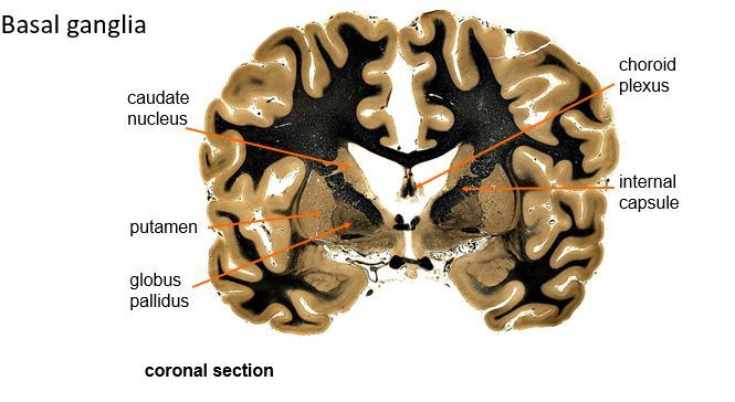 The large ‘hole’ in the middle of the section is the lateral ventricles that are usually filled with cerebrospinal fluid