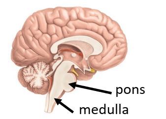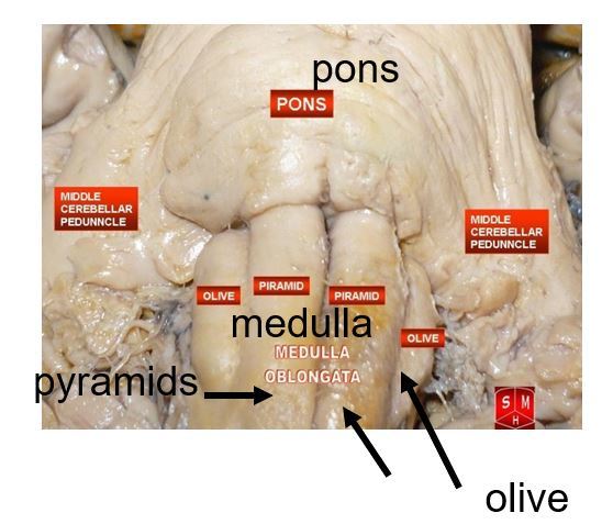 Contains the pyramids (motor tracts); cardiovascular centres (rate/force heartbeat and diameter of vessels); breathing centres; nuclei concerned with touch, pressure and vibration. The olives = proprioception (joint and muscle position)