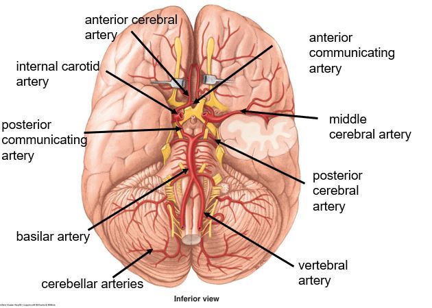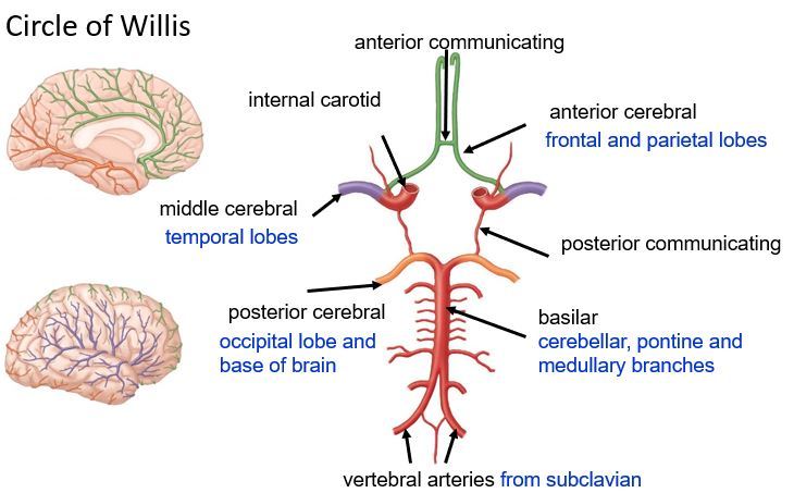 The colours of the vessels correspond to the areas they supply on the diagrams of the brains on this slide.