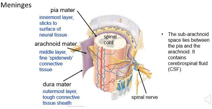 The pia adheres to the surface of the brain – going into the sulci and around the gyri.