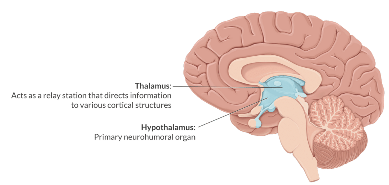 What structures are located in the diencephalon?