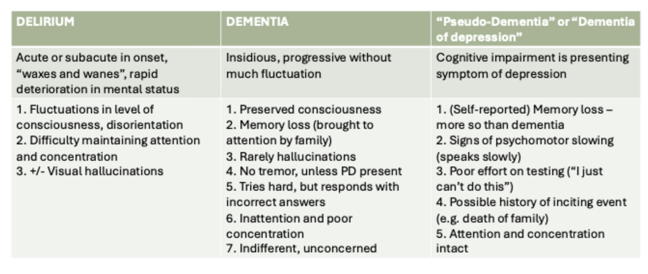 delirium vs dementia vs pseudo-dementia or dementia of depression