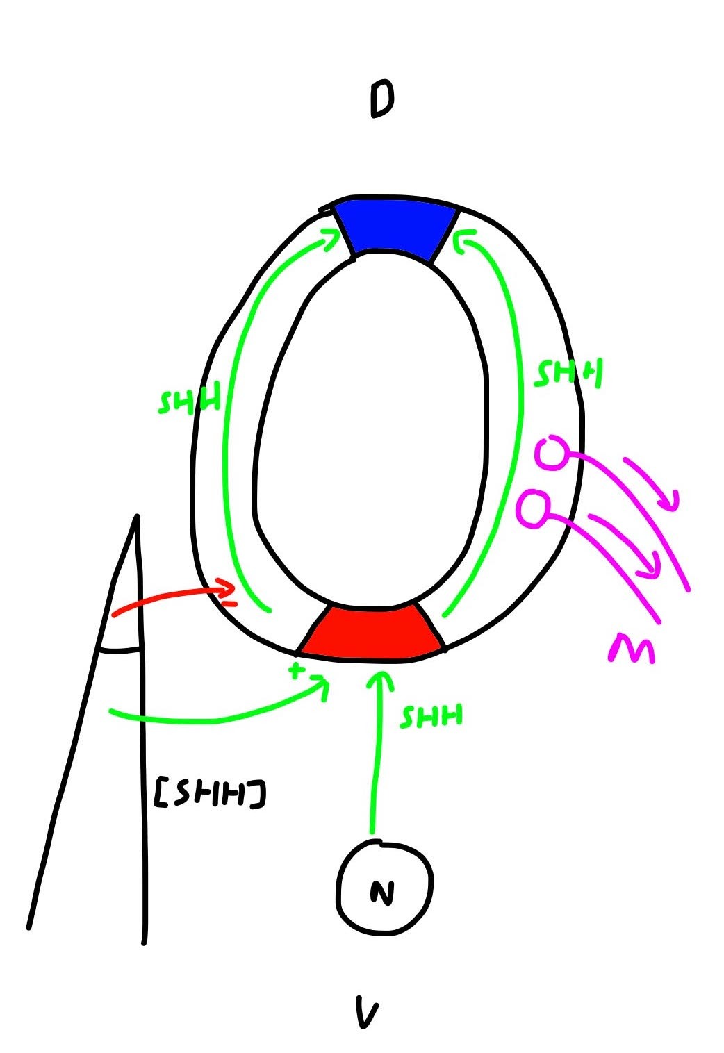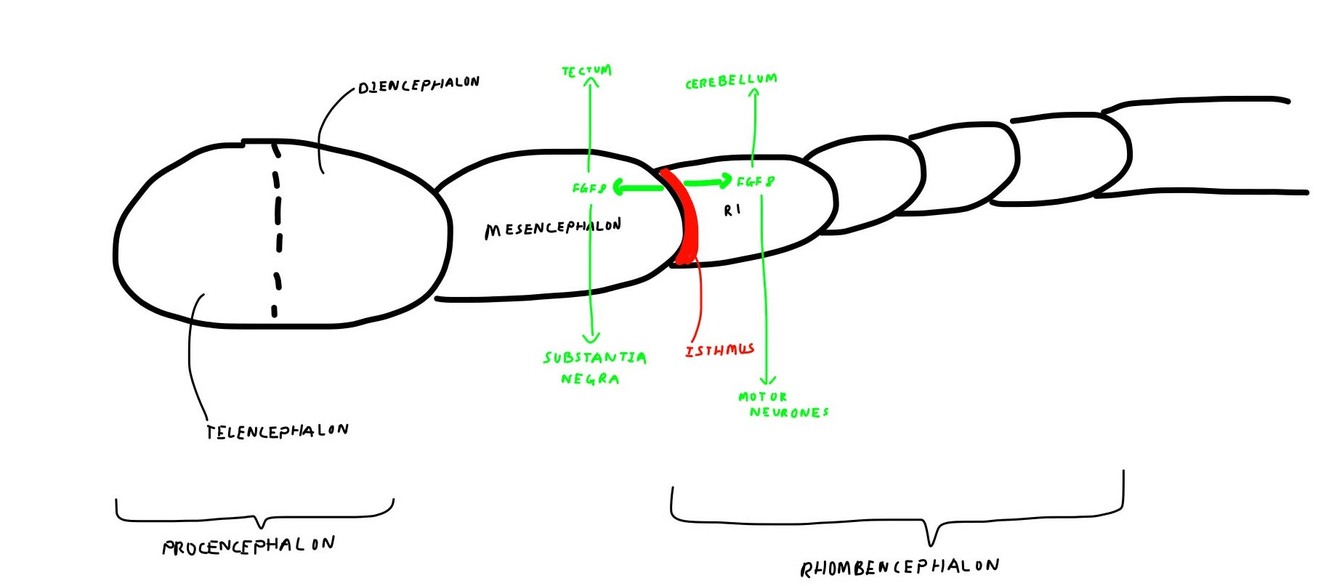Secretes Fgf8, inducing development of the tectum of midbrain rostro-dorsally and substantia negra rostro-ventrally, cerebellum of the hindbrain caudo-dausally and motor neurones of cranial nerve [III] & [V] caudo-ventrally.