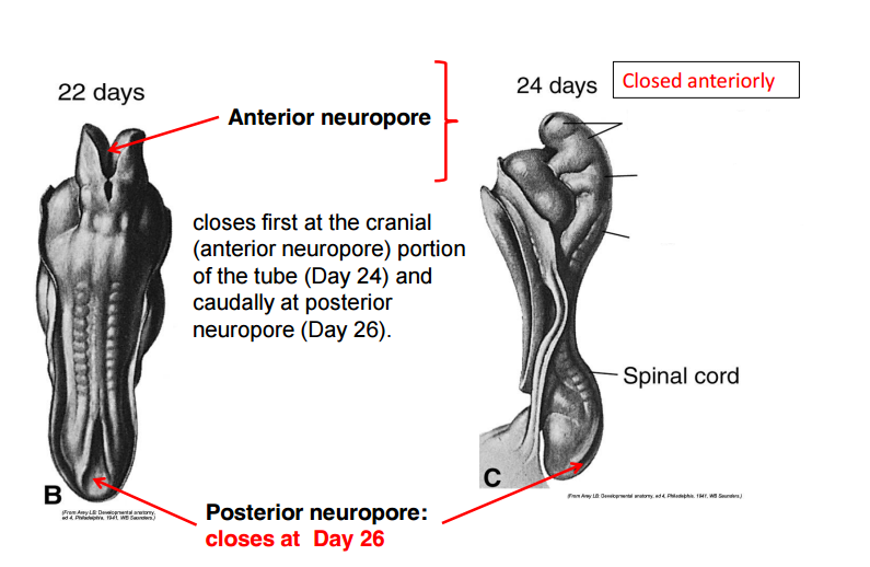 Neural tube development (A) begins with an inductive influence of the underlying mesoderm & notochord on the overlying ectoderm resulting in the formation of a neuroectodermal neural plate. This is followed by development of a neural groove and folding of the plate to begin neural tube formation (B). Closure of the neural tube (referred to as neurulation) begins at the mid-region of the embryo during the third week of pregnancy and proceeds to completion during the 4th week closing first at the cranial (anterior) portion of the tube (Day 24) and caudally at posterior neuropore (Day 26). The neural tube develops into virtually all CNS structures. Its cavity becomes the ventricular system.