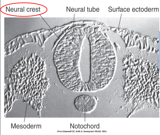 Neural Crest Cells develop at the lateral edge of the neural plate and are pinched off as the neural tube closes; they then migrate giving rise to sensory (DRG) and autonomic ganglia in the PNS, some cranial nerve ganglia, Schwann and satellite cells.