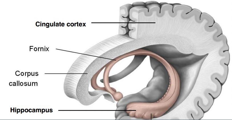 Overgrowth of cerebral cortex around and into the temporal lobe is also manifested in the C-shape of associated structures of the cerebrum and its underlying white matter pathways. These include the: lateral ventricles (not shown), hippocampus, fornix, corpus callosum, cingulate cortex, and the caudate nucleus (part of basal ganglia; not shown here).