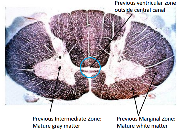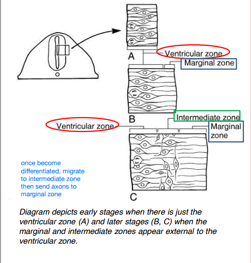 Neuroepithelial cells divide in the subependymal ventricular zone (A and B in attached pic) and then the neuroblasts emerge from this proliferative region and migrate to an intermediate zone where they then send their axons into an external marginal zone (C). Thus the neurons end up in the central gray matter and the white matter is outside.