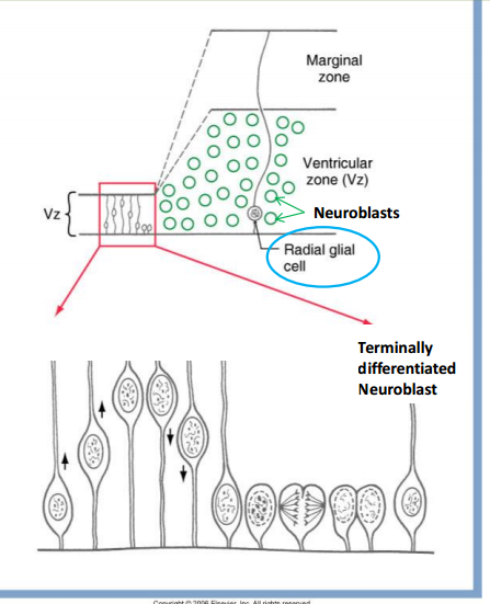 Terminal division occurs in the ventricular zone and then neuroblasts migrate from there on radial glia scaffolding to outer regions of the cortex. Cellular gray matter is located on the external surface of cerebral (and cerebellar) cortex and white matter is located inside. Note: Neuroblasts migrate on stationary radial glia cells. radial glial cells send out processes for Neuroblasts to migrate on (see attached pic).
