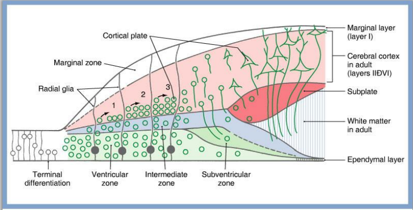 Later development of the cerebral cortex: Inner cellular layers (1) are formed first, and progressively more superficial layers (2, 3) are formed later. Thus, youngest neurons are in the outer gray layers. Then neurons send their processes inward to create subcortical white matter (which is more deeply located).