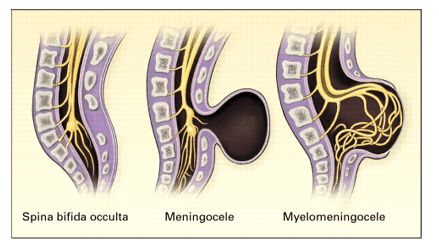 Spina Bifida Occulta (myelocele): is a defect in the vertebral arches that is covered by skin and does not involve the underlying meninges and neural tissue; typically associated with a tuft of hair and/or dimpling of skin in lumbosacral region