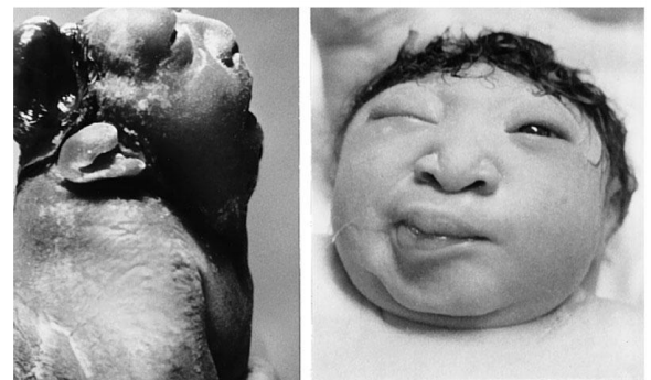 Anencephaly: failure of the cephalic part of the neural tube (anterior neuropore) to close. As a result the skull does not close leaving the malformed brain exposed. This condition is incompatible with life.