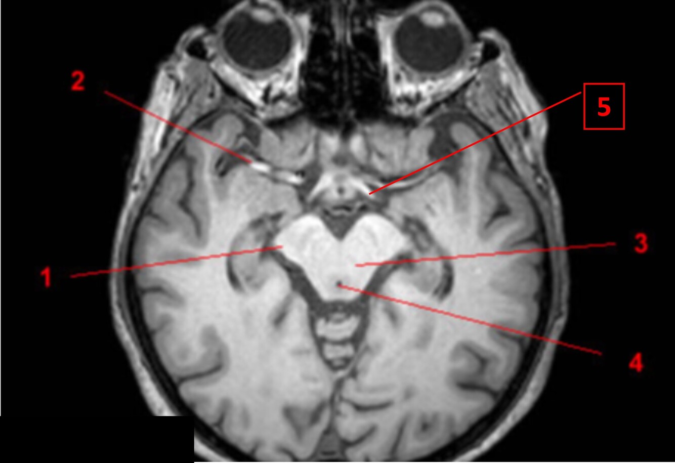 1=Lt cerebral peduncle (midbrain)