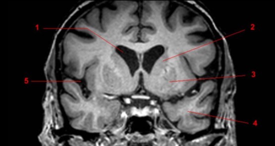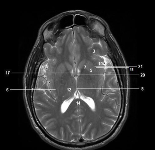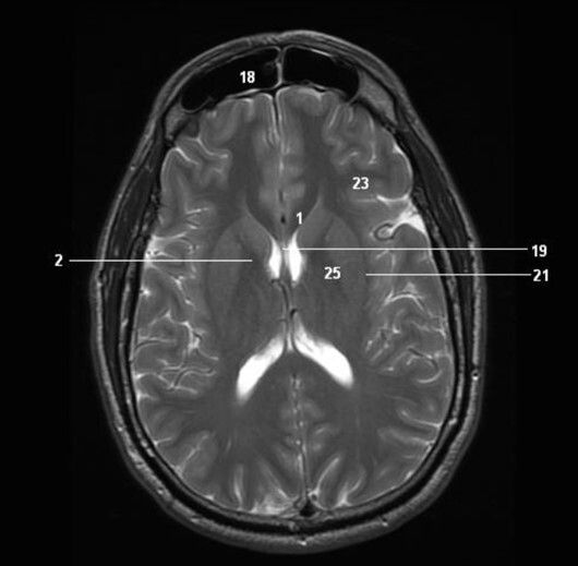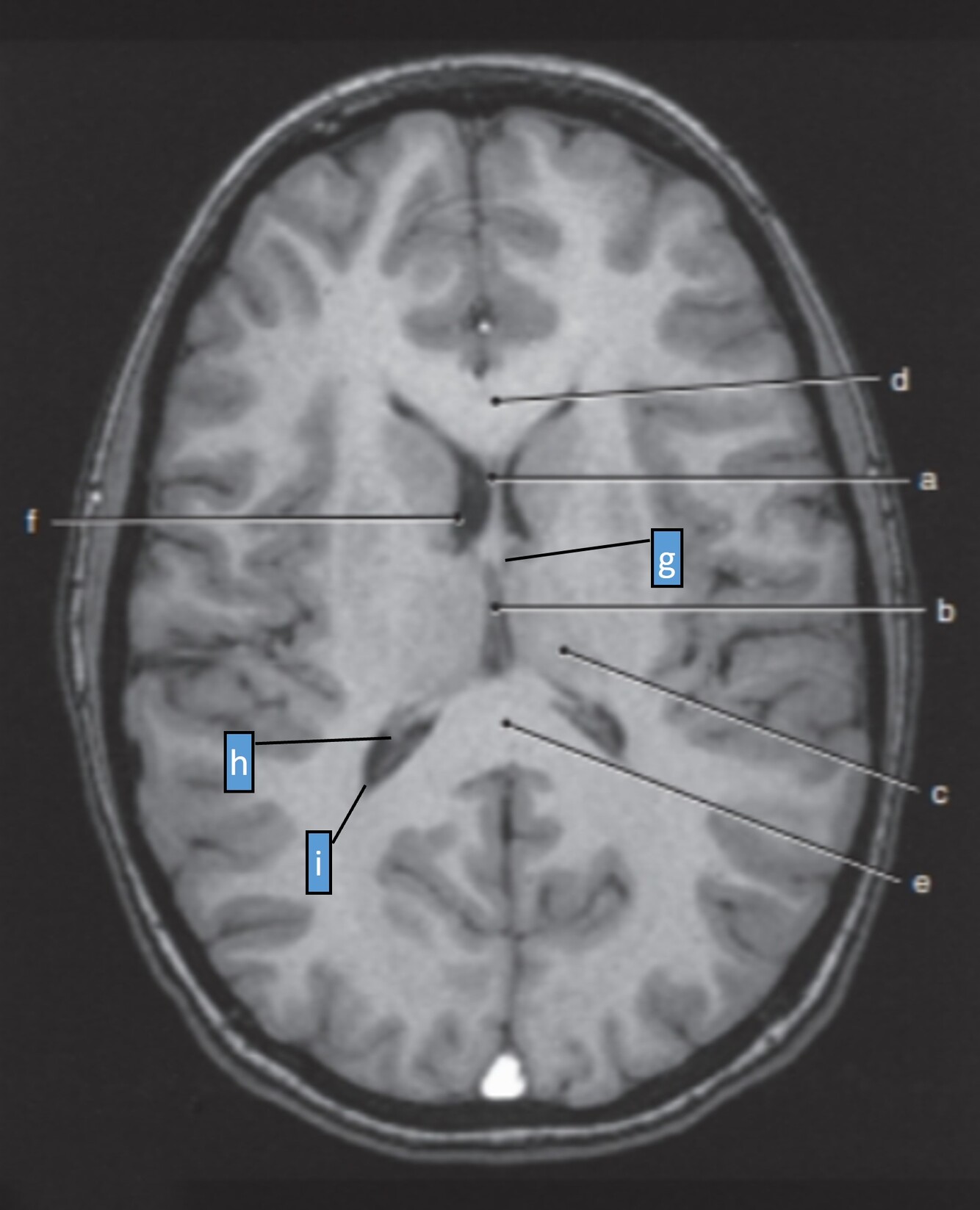 f-Rt lateral ventricle g=Lt foramen of Monro (interventricular foramen) h=Choroid plexus (of rt lateral ventricle) i=Posterior horn (rt lateral ventricle
