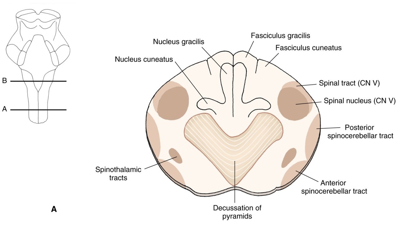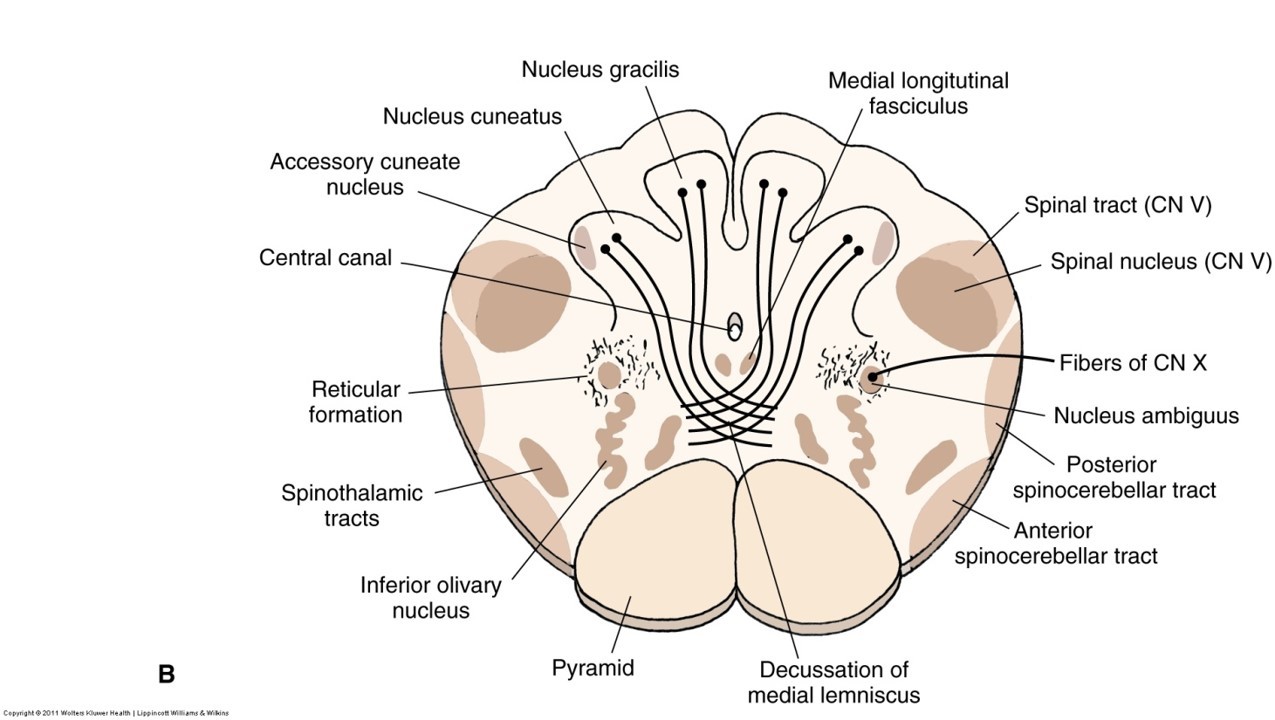 list the fiber tracts located at the caudal closed medulla (level of pyramid decussation)