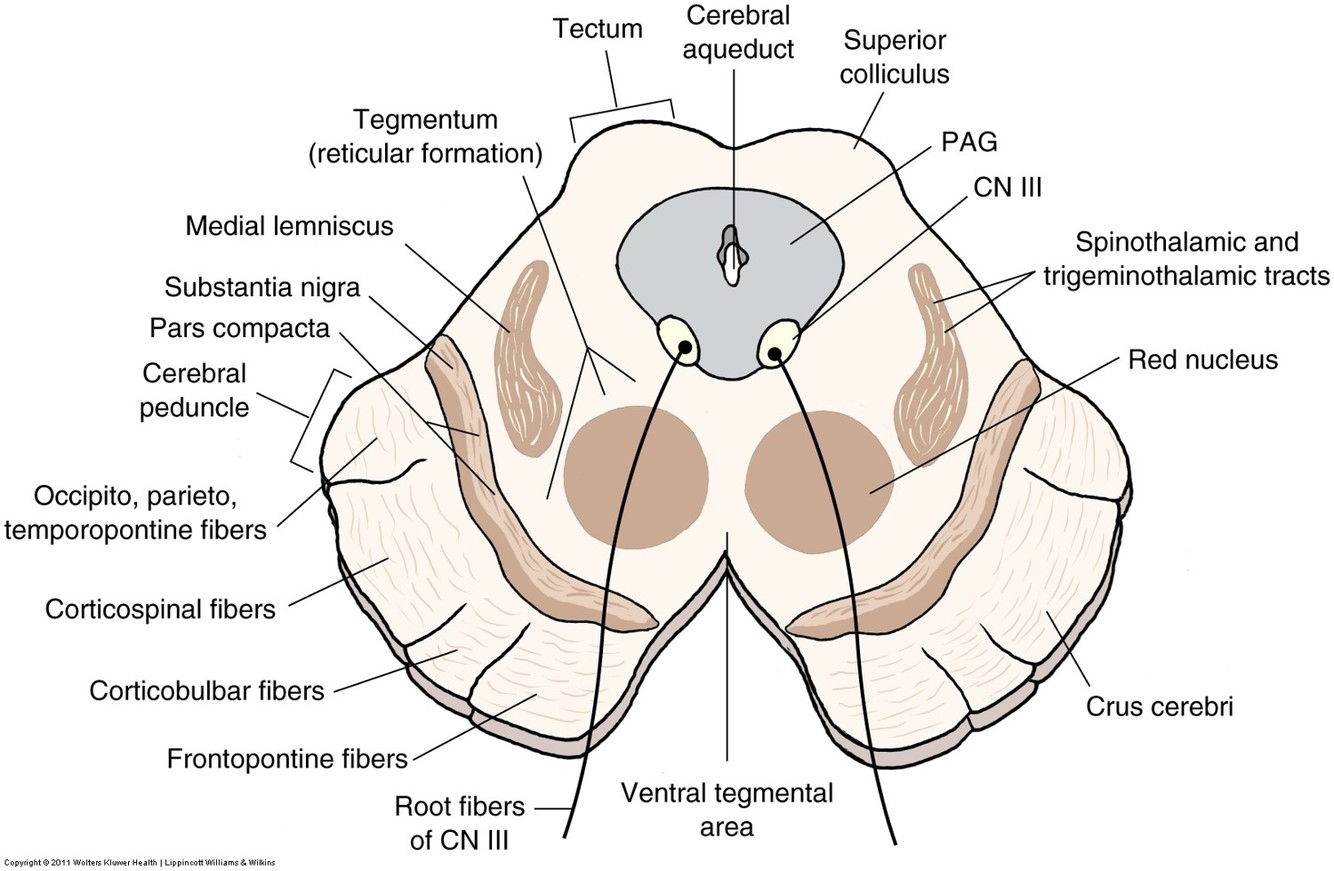 list the tracts located in the tegmentum of the midbrain at the level of the superior colliculus