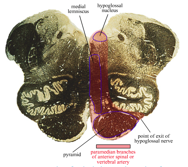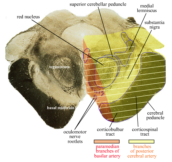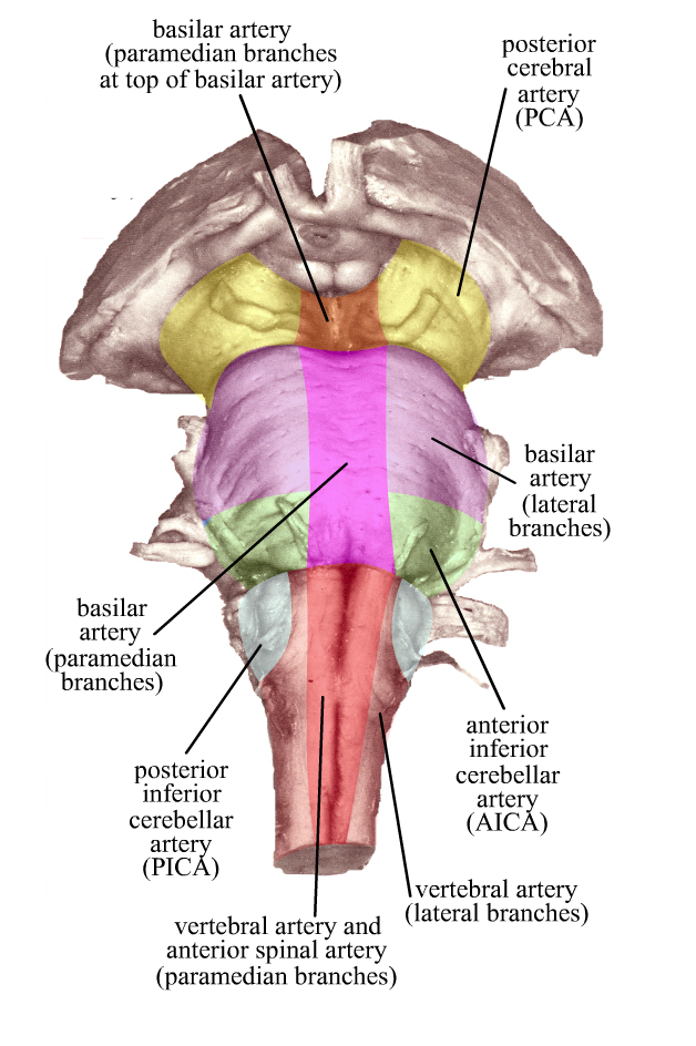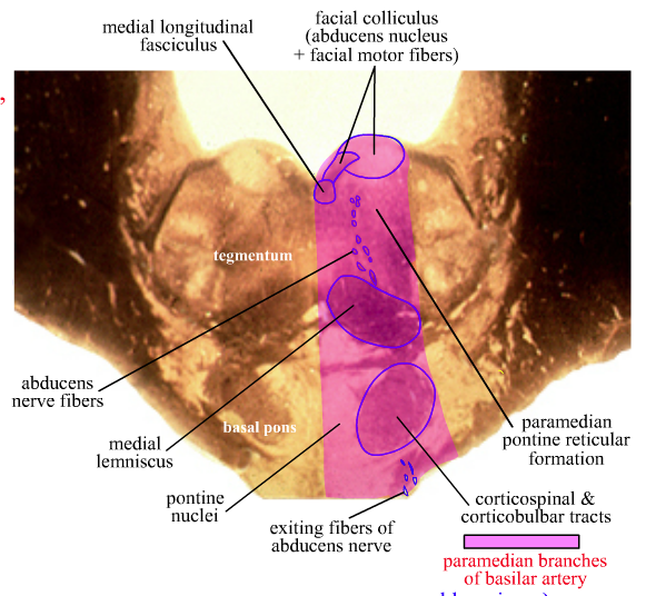 Medial region ⟾ paramedian branches of basilar artery