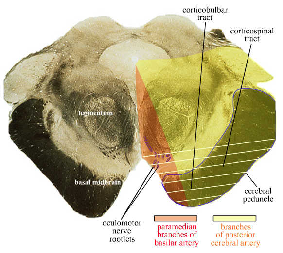 Paramedian branches of basilar artery and posterior cerebral artery (PCA).