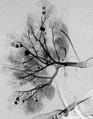 Arteriogram demonstrates multiple aneurysms and irregular constrictions in the larger vessels with occlusion of smaller penetrating arteries in the kidneys consistent with PAN