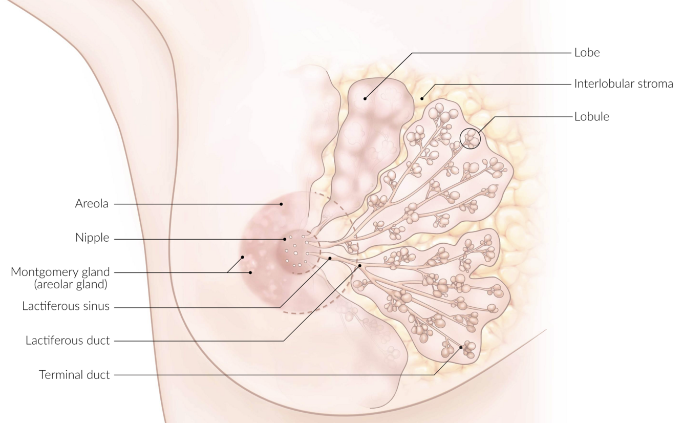 Each lobe is made up of multiple lobules, which are drained by a single lactiferous duct that opens onto the surface of the nipple