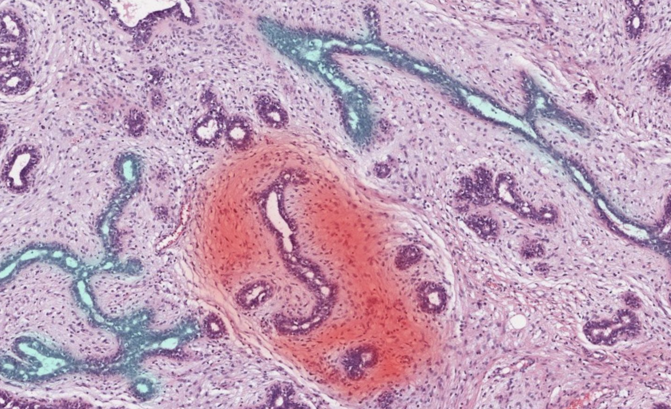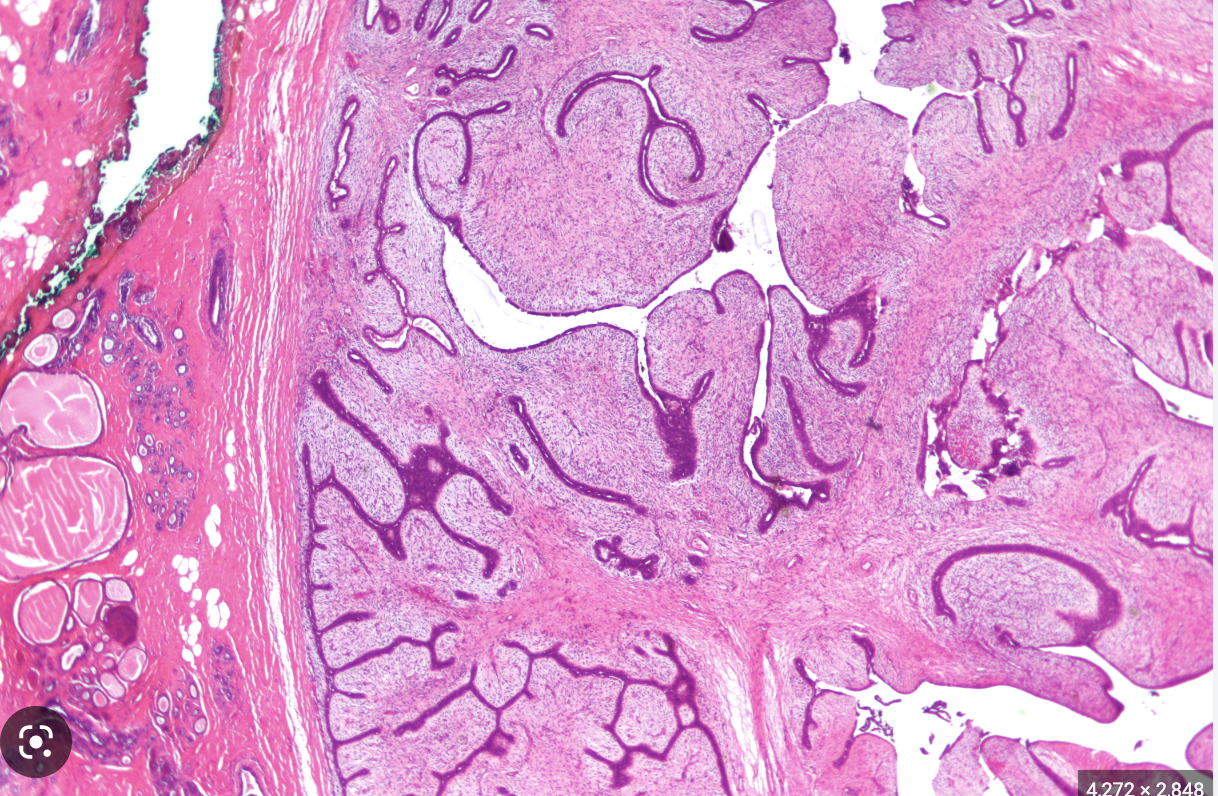 * Multinodular mass of expanded intralobular stroma (red overlay)
