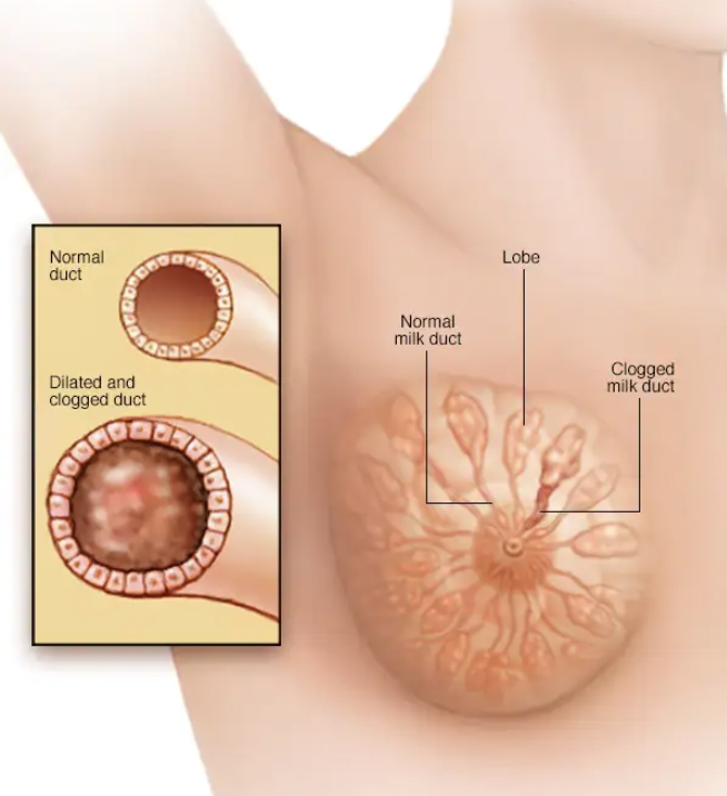 Chronic inflammatory process leading to dilation of terminal (subarolar) lacifrous ducts due to stasis of secretions (blockage)