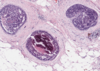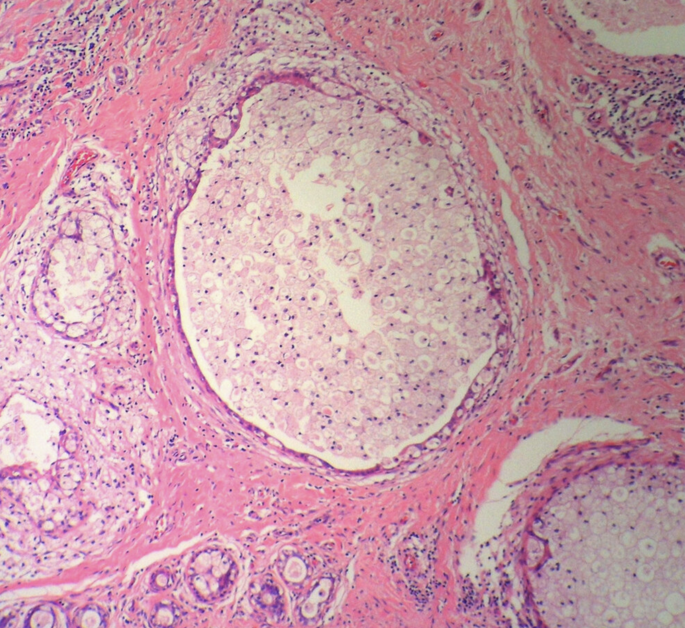 Cytology of nipple discharge: proteinaceous material and macrophages (buzzword)