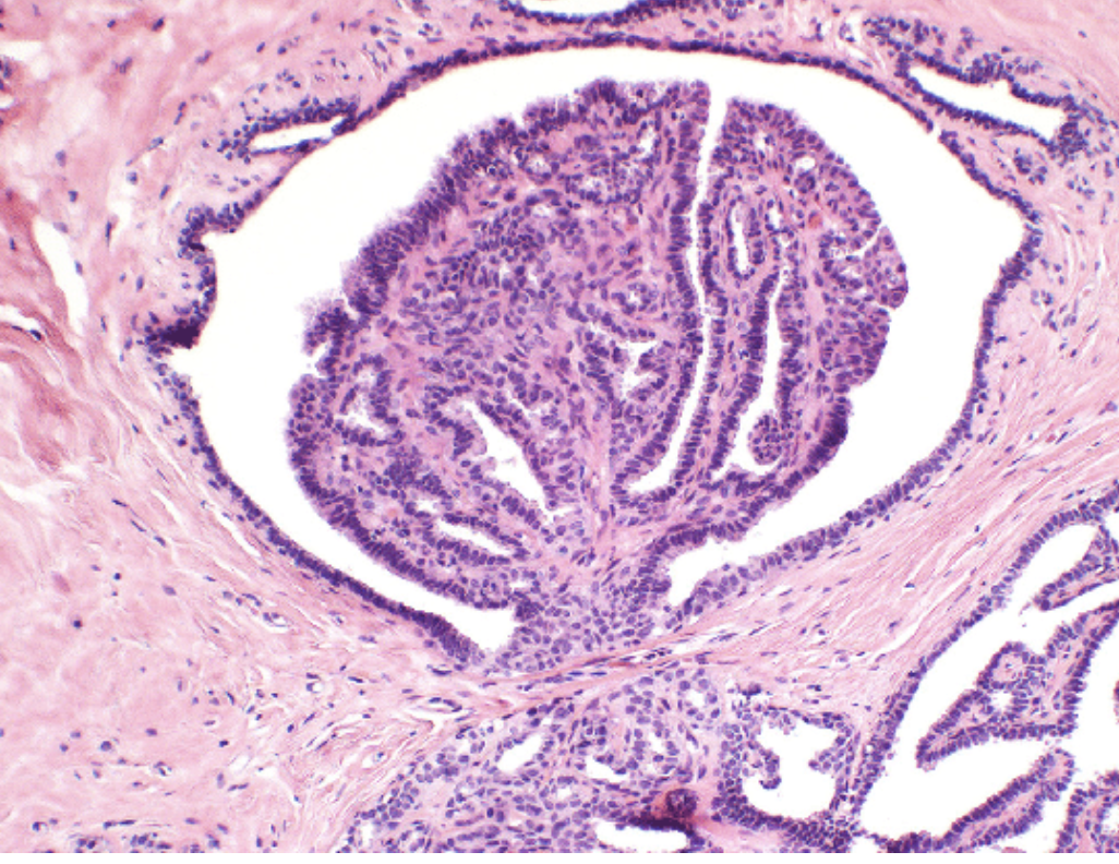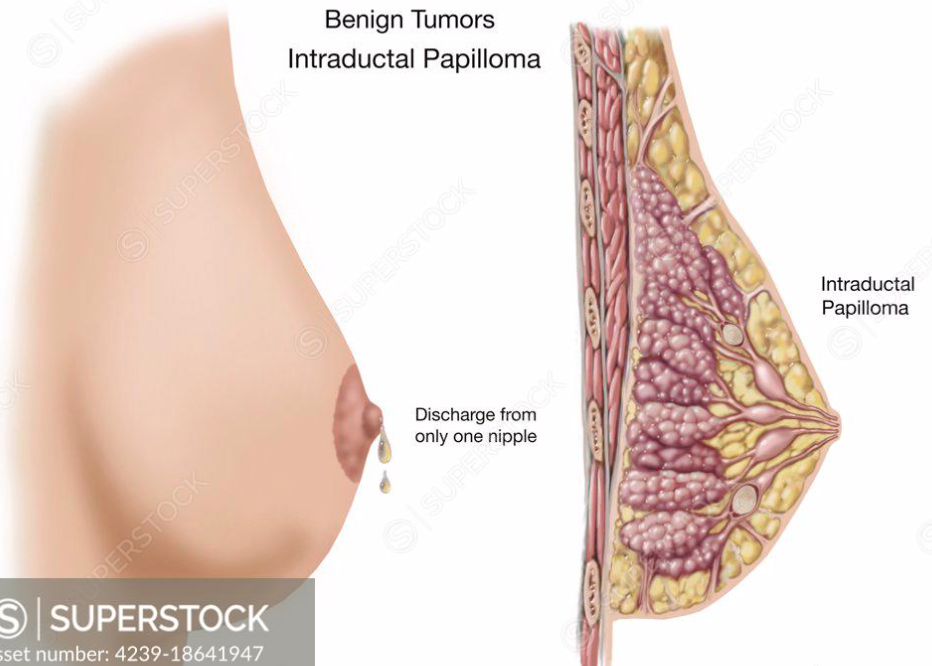 Clinically presents with a sub-areolar mass +/- bloody nipple discharge