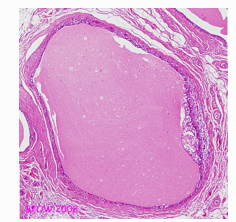 Cysts lined by flattened (larger cysts) to low cuboidal epithelium (smaller cysts)