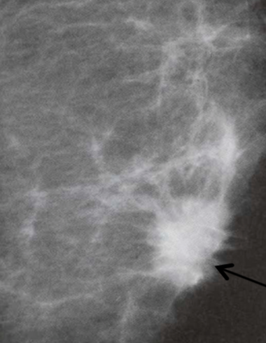 A woman presents with a hard breast lump with irregular borders. She has had surgery on her breast in the past. Mammogram is performed