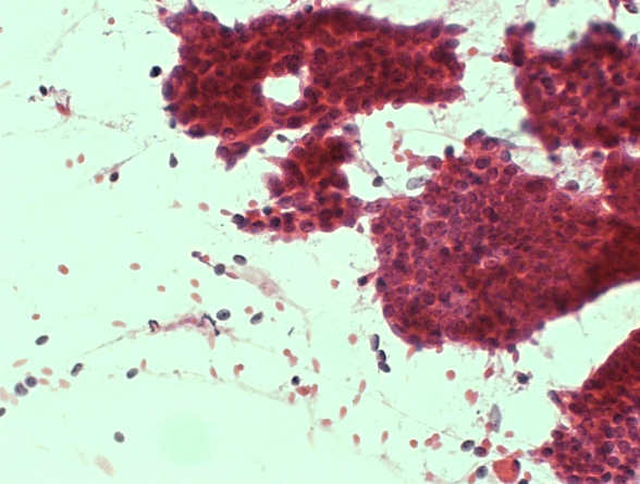 A 30yo woman presents with a smooth, mobile lump that is about 1cm in diameter. FNA is performed
