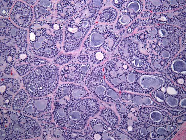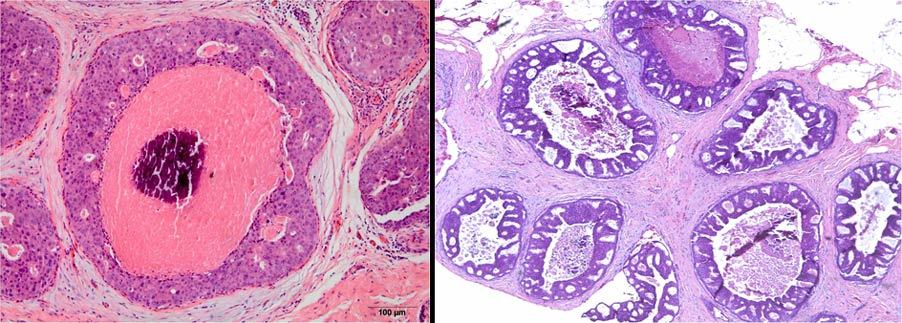High grade DCIS is non-reactive with CK 5/6 as opposed to ductal hyperplasia which shows significant positivity.