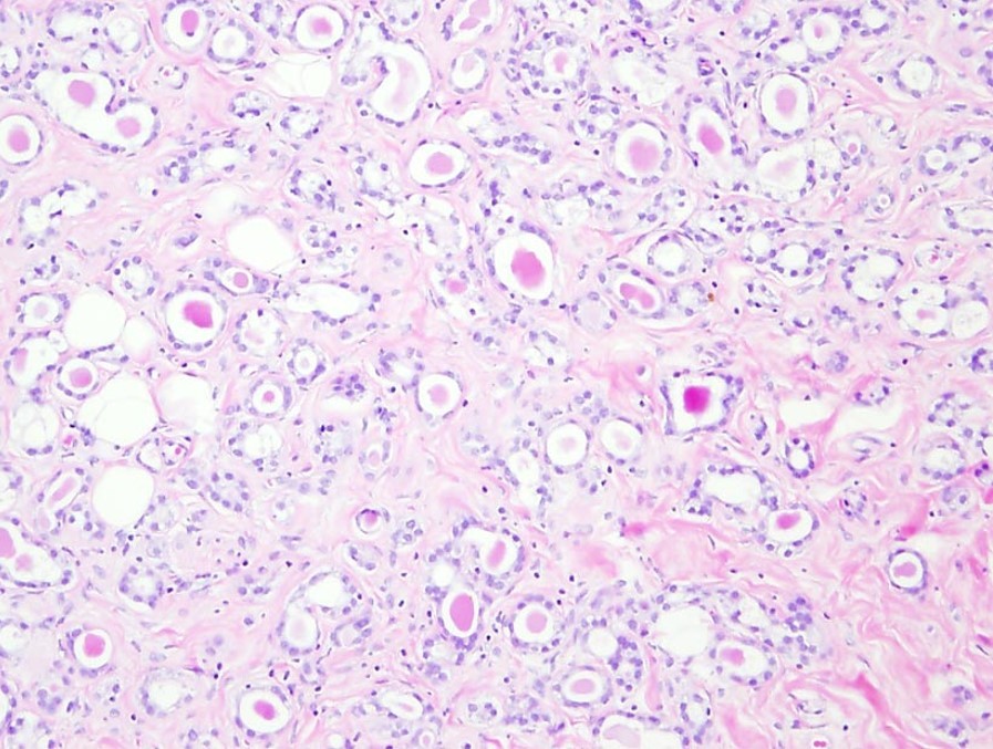 Despite that it is rare to be associated with an atypical proliferative lesion, when it occurs, the most common atypical lesion encountered is __