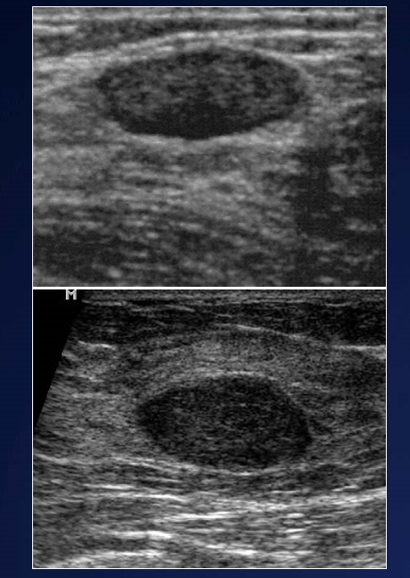Describe the appearance of benign solid breast lesions on US