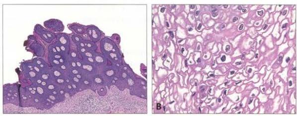 Pretty much the same thing as the extramammary Paget’s disease except it is ALWAYS associated with an underlying carcinoma. It has ulcerated vulvar skin that stains PAS+ve, Keratin +ve, & S100-ve.