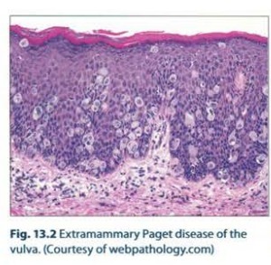 Malignant epithelial cells in the vulvar epidermis. It presents as erythematous, pruritic, & ulcerated vulvar skin that stains PAS+ve, Keratin +ve, & S100-ve. It represents carcinoma in situ but it is usually not associated with underlying carcinoma EXCEPT for pagets disease of the nipple