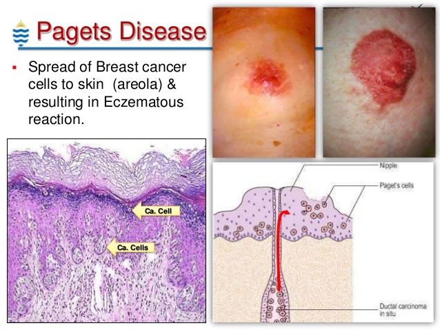 What are the symptoms of Paget disease of the breast?